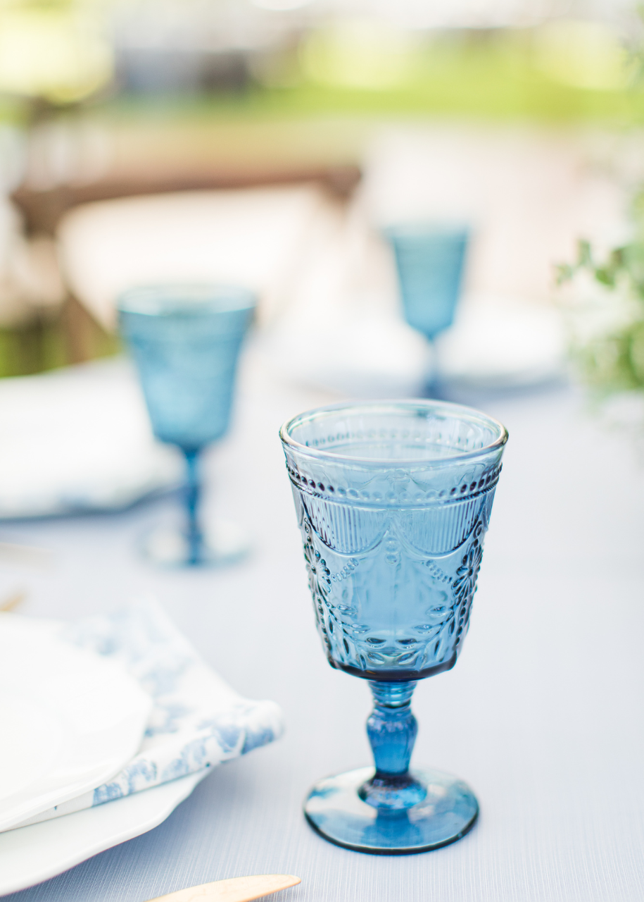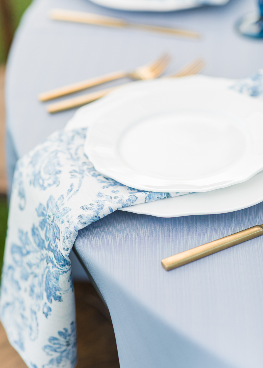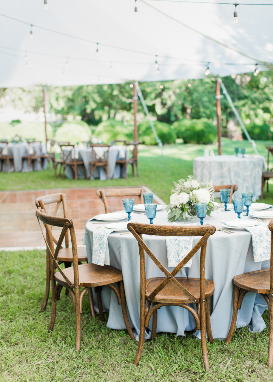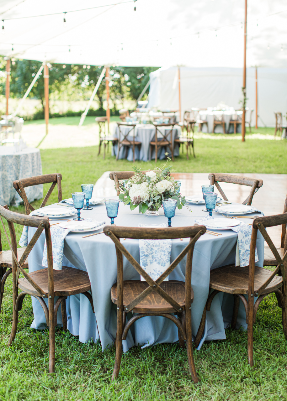 Price Rentals and Events installed a prestige sailcloth tent with string lights that looked so romantic under the moonlight. One of my favorite details of their day was the tablescape of their guest tables. Price Rentals and Events handpicked the seamless, slate blue linens with patterned napkins to complement one another. The scalloped, white dinner plates paired with sleek, golden flatware was quite the welcome to guests as they found their seat. The water goblets were the finishing touch that popped against the luscious blooms designed by J. Starr’s Flower Barn.